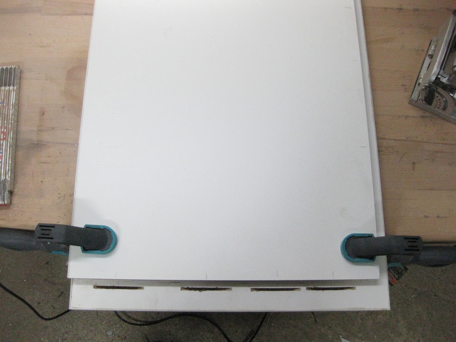 Nachdem man die Spanplatten ohne Leim zusammenstecken kann, kann man für die endgültige Verbindung auch Leim verwenden. Den Fehler habe ich schon einige Male gemacht, es nicht vorher "trocken" zu probieren.