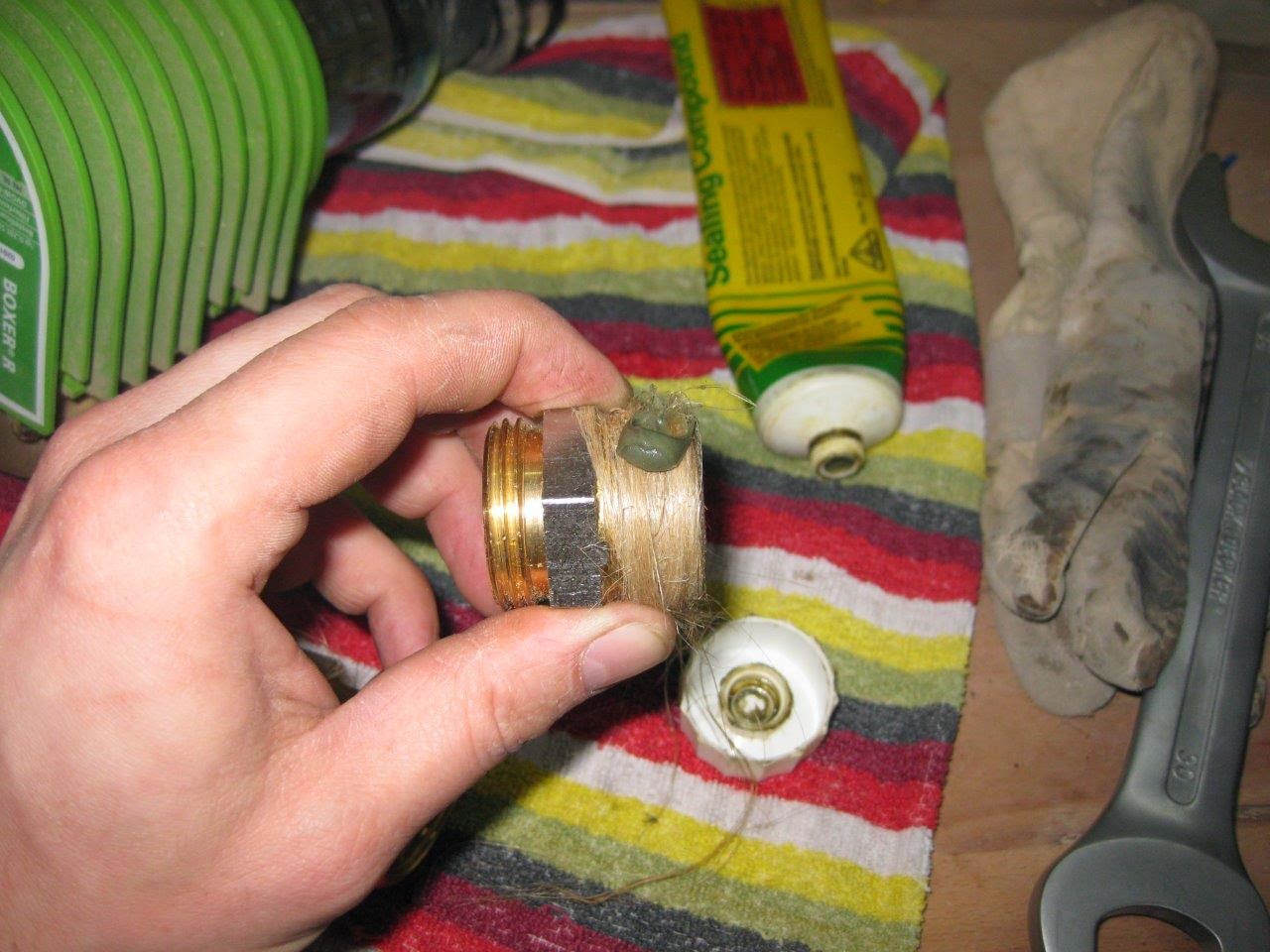 Danach habe ich die Verschraubungen (Holländer) mit den Kugelhähnen verschraubt. Als Dichtung dient Hanf. Da ich kein Installateur bin und ich kein "gefährliches Halbwissen" verbreiten möchte, schreibe ich keine genaue Anleitung. Die Hanffäden müssen richtig (ohne Knoten) aus dem Zopf gezogen werden. Danach wird der Hanf in jene Richtung auf das Außengewinde gewickelt, dass es sich beim Raufschrauben nicht wieder runter runterwickelt. Wieviel Hanf verwendet werden muss weiß ich nicht genau. Ich achte drauf dass das Gewinde bedeckt ist, und vielleicht noch ein bisschen mehr, so dass es schön streng zum schrauben geht. Ob das so stimmt kann ich nicht sagen, aber bis dato ist noch alles dicht. Abschließend wird noch die Paste (Locherpaste) über dem Hanf verschmiert.