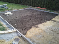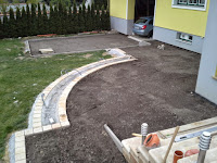 Der begehbare Bereich wird mit etwas schöneren Steinen eingefasst. Da diese nur eine Höhe von 3-4cm haben müssen sie ebenfalls einbetoniert werden. Dazu kann der erdfeuchten Beton mit etwa 10cm Schichtdicke direkt auf den Frostschutzschotter aufgetragen werden. Im Beton werden anschließend die Steine gesetzt und ausgerichtet. Die Maurerschnur leistet auch hier einen hilfreichen Beitrag.