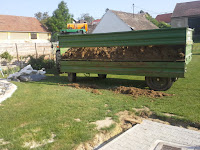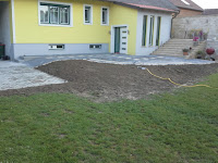 Genau rechtzeitig vor dem Regen wurde die Erde geliefert, um das Gartenniveau ans Pflasterniveau anzugleichen. So ein Frontlader ist schon ein praktisches Feature, wenn's um das Verteilen der Erde geht. Gras wurde auch gleich angebaut.