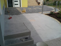 Eine größere offene Baustelle war noch die Stufe. Hier hatte ich den Einfassungssteine so hoch betoniert, dass ich die Pflastersteine nicht mehr setzen konnte, da diese nun zu dick waren. Zum Glück fand ich jemanden, der mir die Steine auf 2,5cm Dicke geschnitten hat. Aufgrund der geringen Dicke habe ich die Steine der Treppe nicht in Kies, sondern in erdfeuchten Beton gelegt.