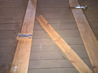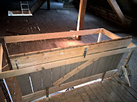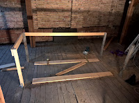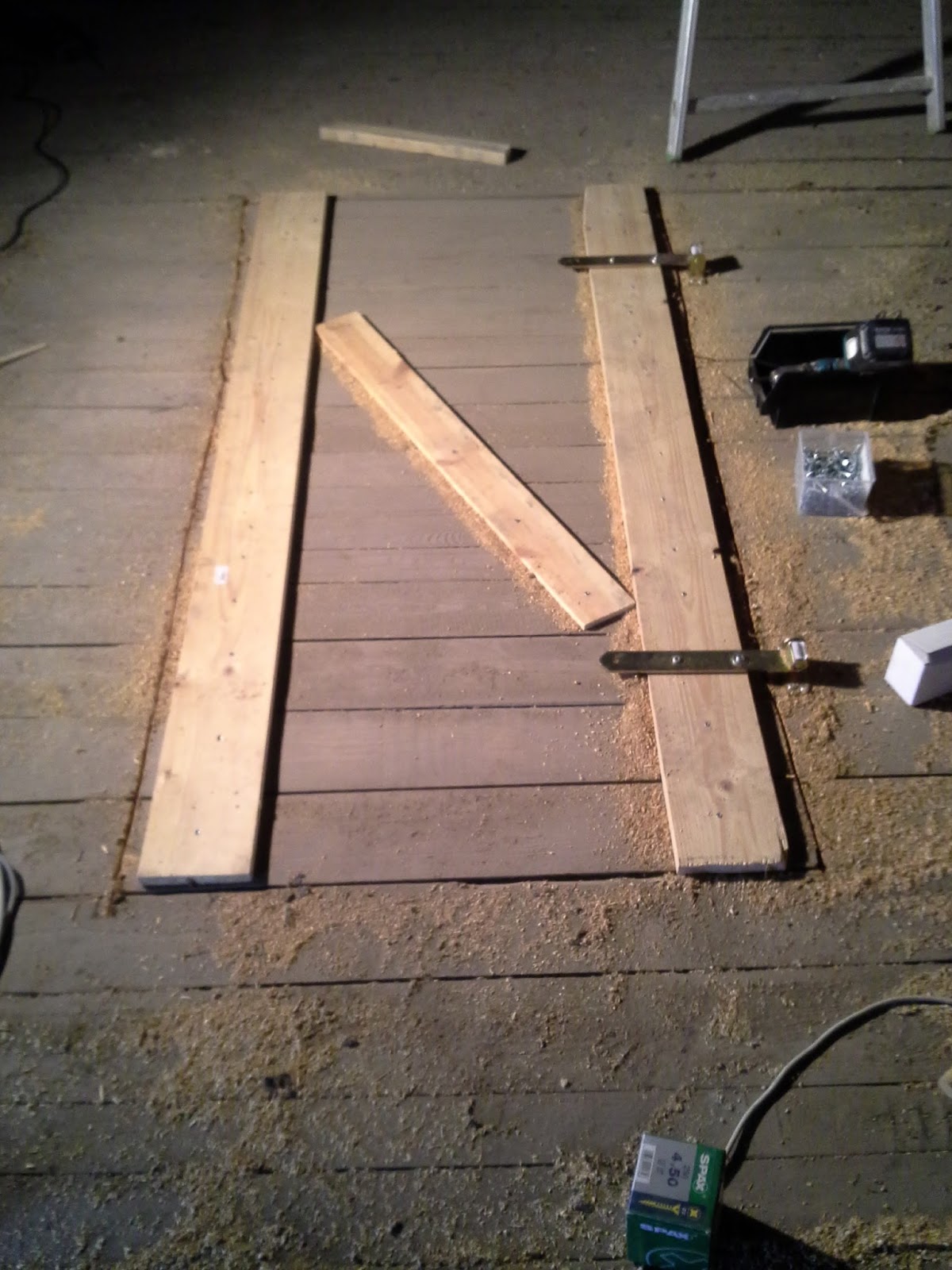 Mit der Kettensäge habe ich die Bretter geschnitten. Der Schnitt ist etwas krumm, aber nicht weil ich alkoholisiert war, sondern weil ich den Nägeln ausgewichen bin.