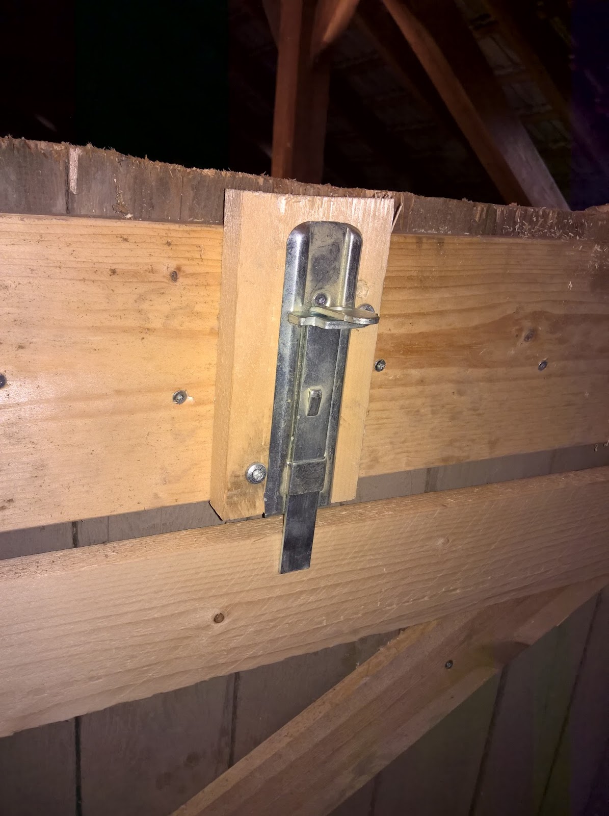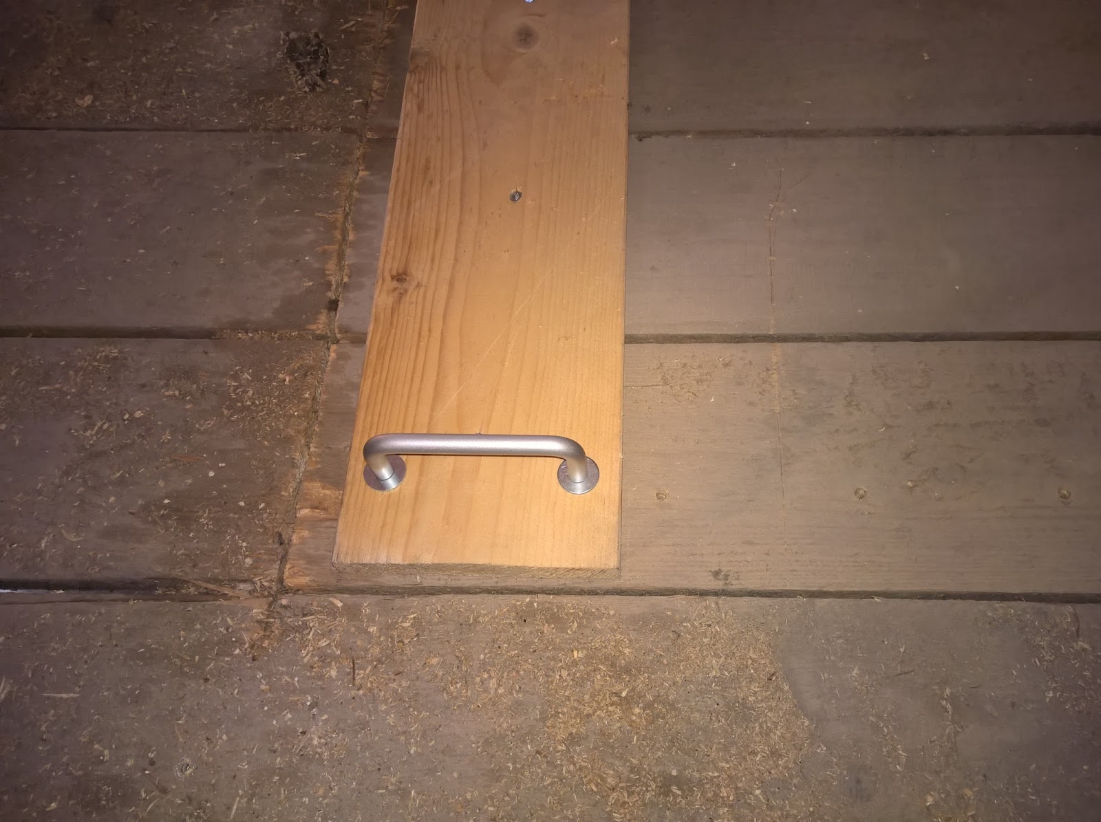 Damit die Klappe leichter zu öffnen ist, habe ich einen Griff montiert. Ebenfalls habe ich einen Riegel angeschraubt, da die Klappe nicht selbständig offen bleibt.