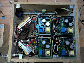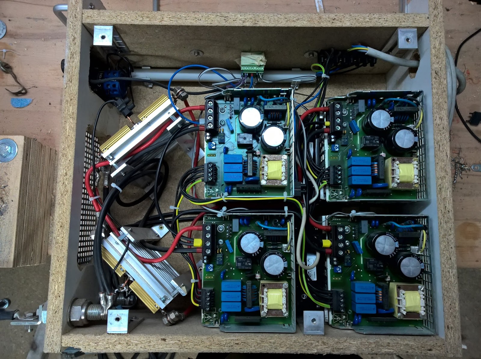 Rechts unten befinden sich die 4 Stromversorgungen, bei deren Entwicklung ich ebenfalls mitgewirkt habe. Dadurch war es für mich keine Problem diese als Stromquelle umzubauen. Dazwischen sitzen zwei Lüfter.