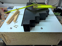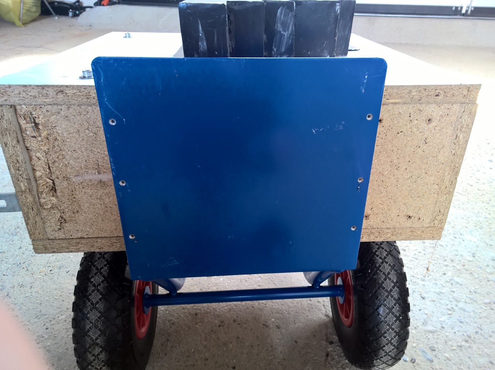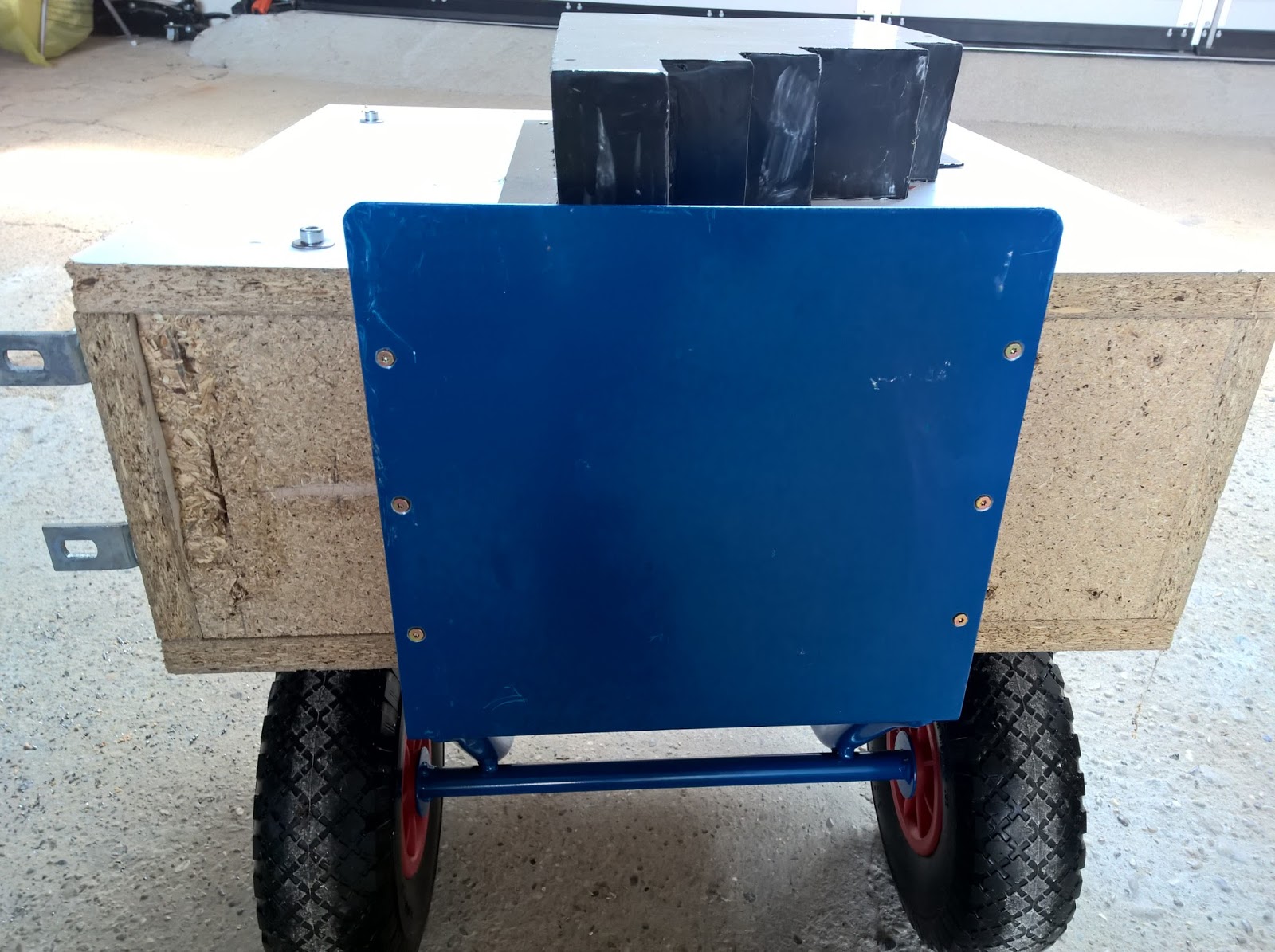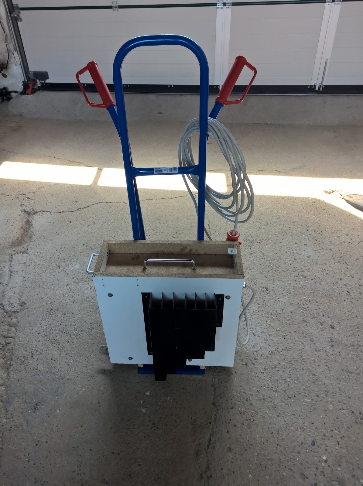 Das Gehäuse des Gerätes hatte ich damals aus Spanplattenresten zusammengezimmert. Diese sind leider sehr empfindlich was Feuchtigkeit betrifft und ich wollte daher nicht, dass das Gehäuse direkt am Boden steht. Um dem vorzubeugen wurden in der Breite der Auflage der Sackkarre 20x20mm starke Leisten mit dem Gehäuseboden verschraubt.