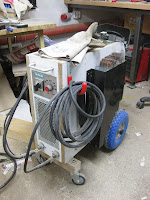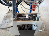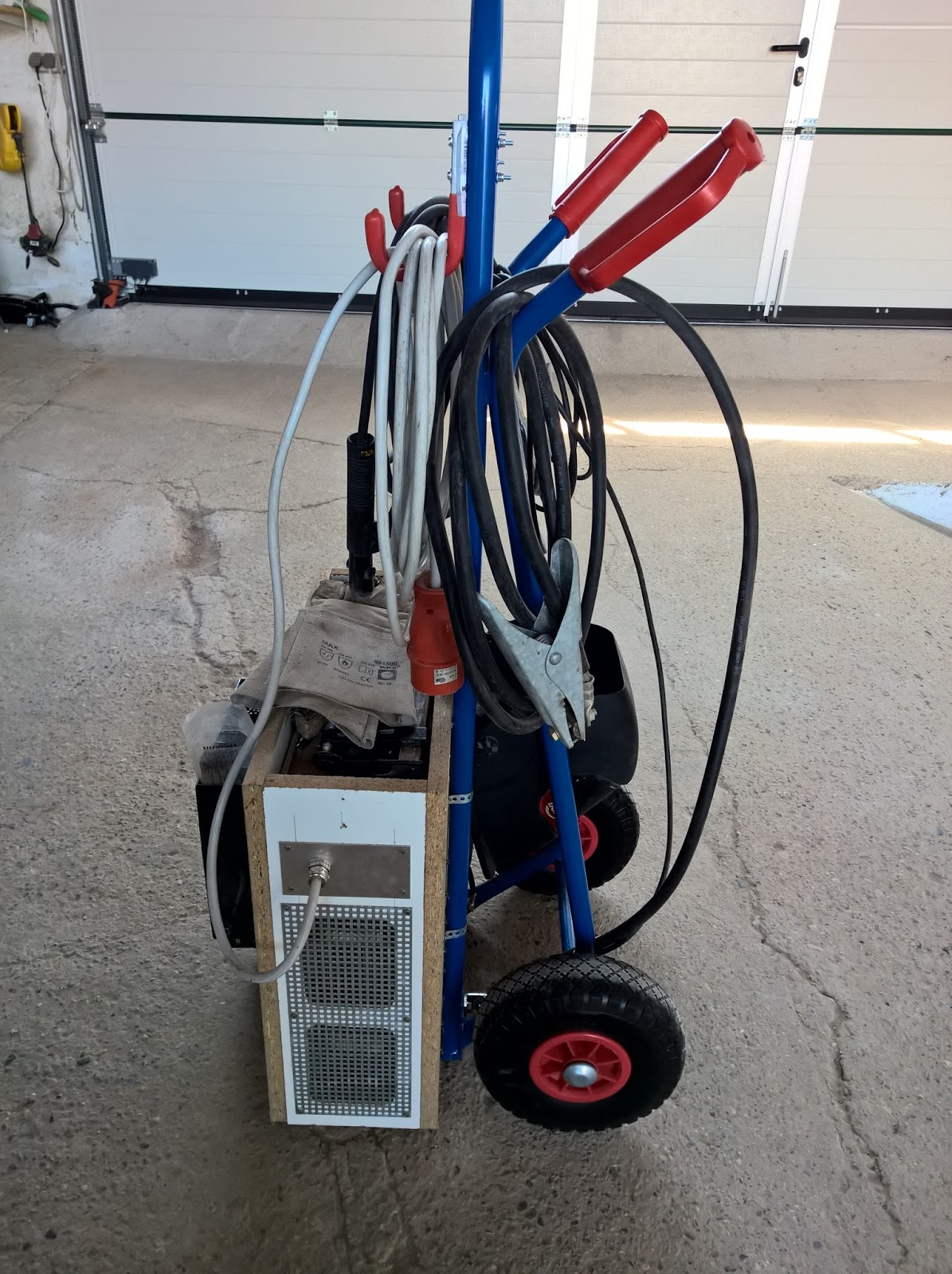 Am Schweißgerät selbst habe ich schon beim Gehäuse eine Ablage für Drahtbürste, Schlackenhammer und und und ... verbaut. An der vorderen Seitenwand befindet sich die Elektrodenaufbewahrung. Der Schweißhelm wird an die Rückseite, an einem Winkel am Gerät, gehängt.