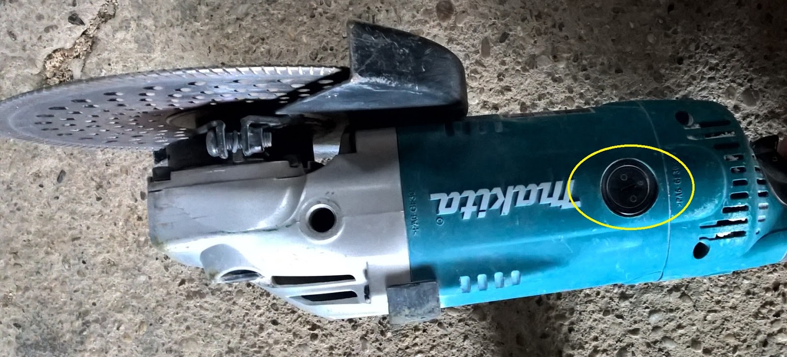 Es ist zwar nicht offensichtlich, aber der Ein/Aus Schalter kann auch arretiert werden. Dazu wird dieser von der 0 auf die 1 Position geschoben und an der Stirnseite nach unten gedrückt. Gelöst wird die 'Arretierung durch Druck an der gegenüberliegenden Seite des Schalters. So schaltet man leider den Winkelschleifer auch ab und zu mal ungewollt aus. Aber die Arretierung erfolgt ohne zusätzlichen Druckknopf o.ä. , wie es oft bei Bohrmaschinen der Fall ist, und das ist der große Vorteils des Schalters.