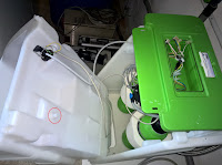 Die Anlage hat ja eigentlich einen Überlauf, der direkt in den Abwasserkanal abfließt. Eigentlich ist auch das Wasser nur bis zum Überlauf gestiegen, eigentlich. Nur ist es halt nicht in den Überlauf geflossen, sondern durch dessen undichten Einbau ins Geräteinnere und von dort in die Freiheit, also unseren Keller. Jetzt weiß ich endlich warum in der Bedienungsanleitung die Entkalkungsanlage immer neben einen Abfluss steht... Bei einem Neubau sollte dieser somit unbedingt eingeplant werden. Gottseidank habe ich den Defekt noch rechtzeitig bemerkt. Was wäre passiert wenn ich ein paar Tage nicht in den Keller gehe oder auf Urlaub bin?