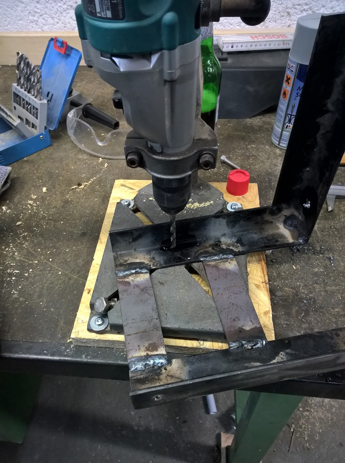 Zum Schluss habe ich noch Montage- und Befestigungslöcher gebohrt. Der Doppelschleifer kann mittels zweier Schrauben montiert werden. Da ich die Wandhalterung nicht breiter als die Unterseite des Schleifers machen wollte, bleibt für dessen Montage kein Platz für eine Mutter. Daher habe ich das Gewinde in die Halterung geschnitten. Bei 4mm Wandstärke hält das auch ordentlich.