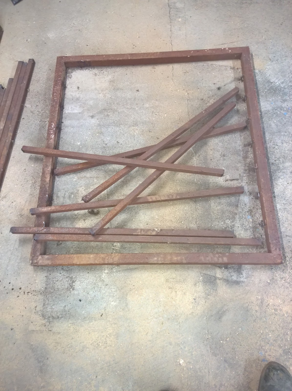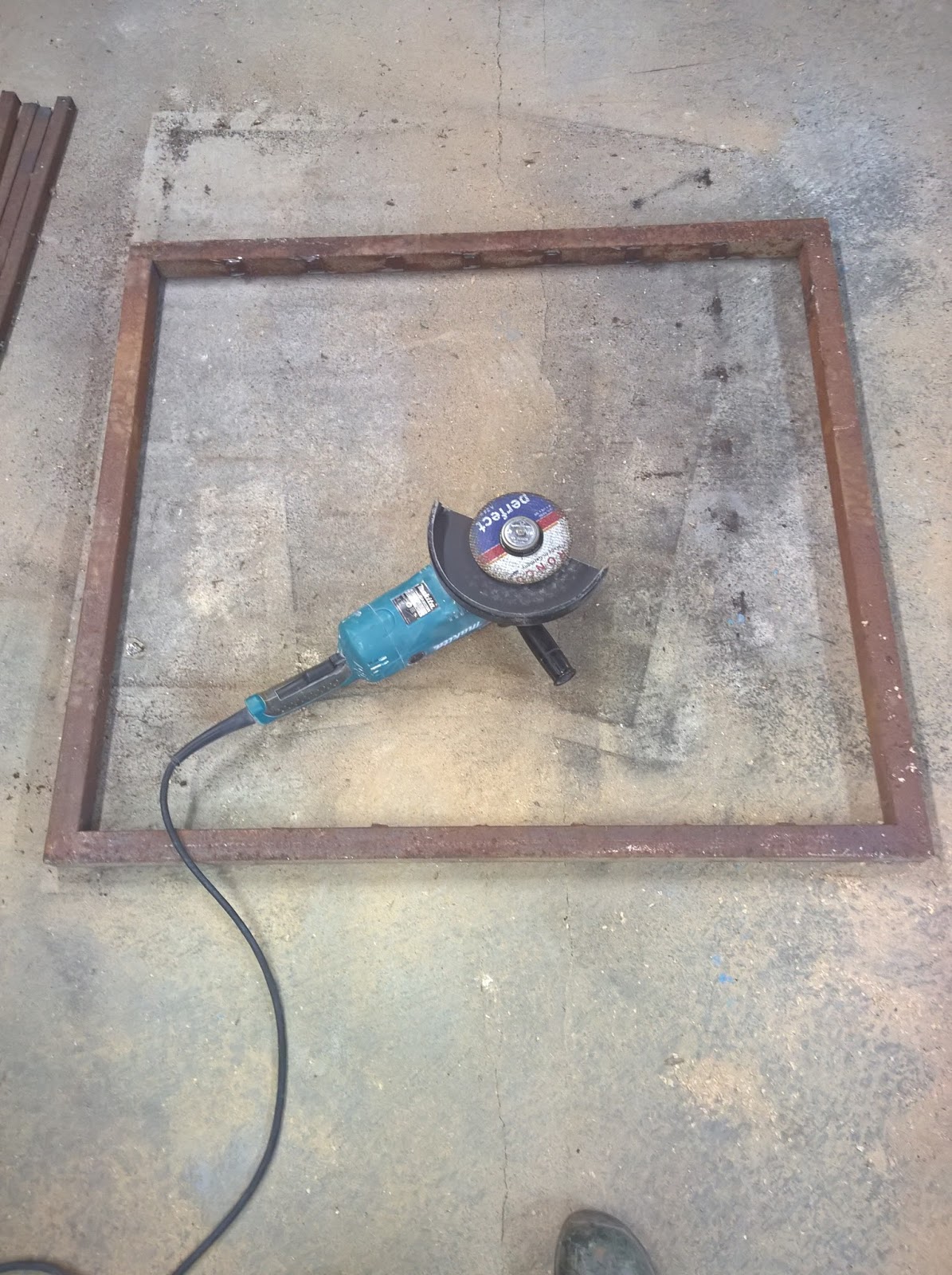 Die Teile waren etwa 100x110cm und hatten einen Rahmen aus einem 40x40x2mm Formrohr. Die Stäbe in der Mitte haben die Abmessungen 25x25x2mm. Diese sind in leider mittig und daher nicht auf einer Seite bündig mit dem Rahmen verschweißt. Noch dazu soll mein Tisch etwa 150x100cm werden. Also müssen zuerst die Stäbe raus und der Rahmen vergrößert werden.