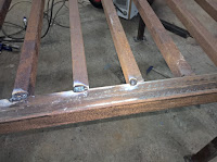 Die Auflage für die Räder habe ich aus 5cm Breiten Flachstahl zusammen geschweißt, entsprechend gebohrt und an die Füße angeschweißt.