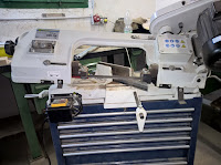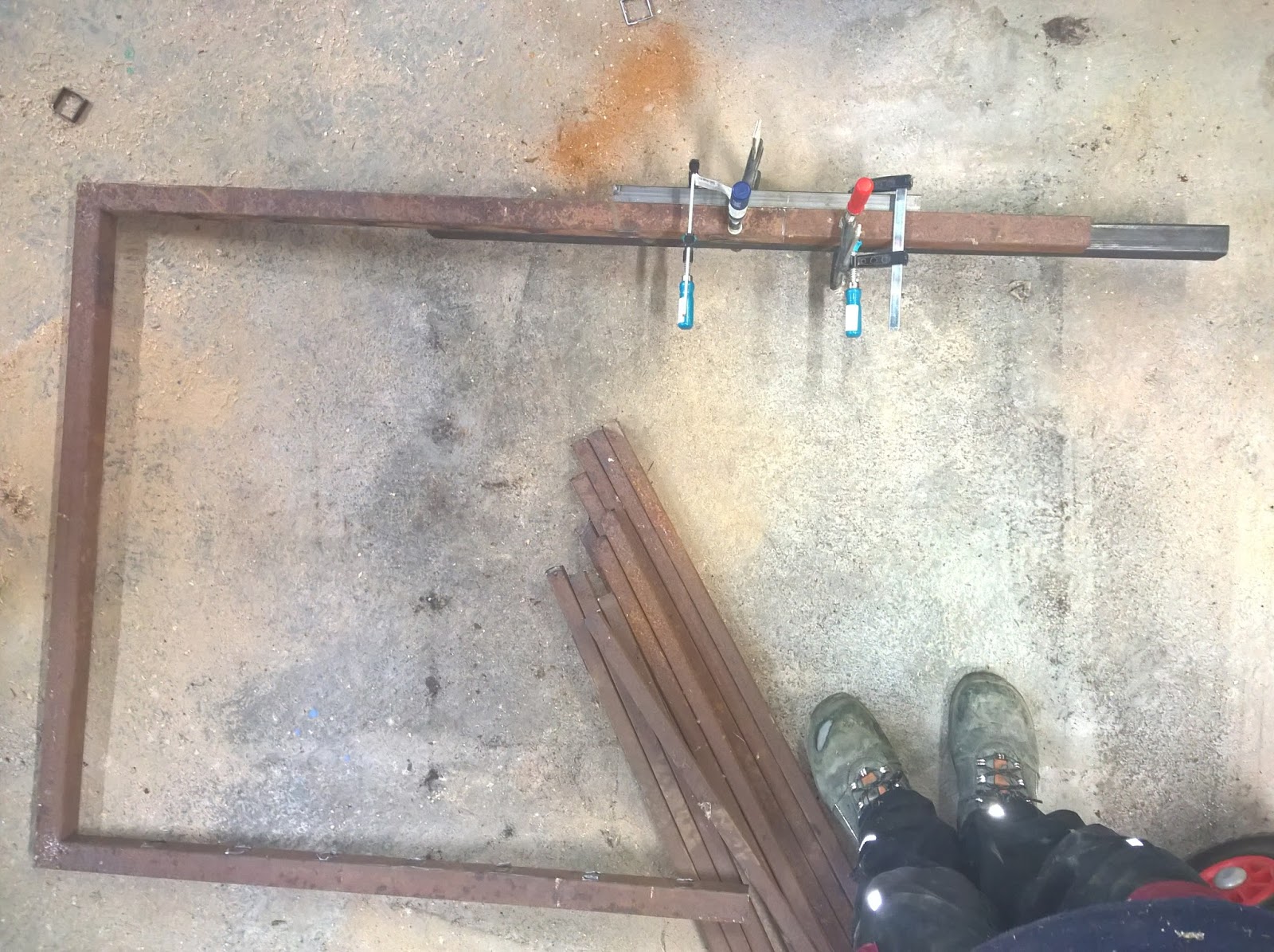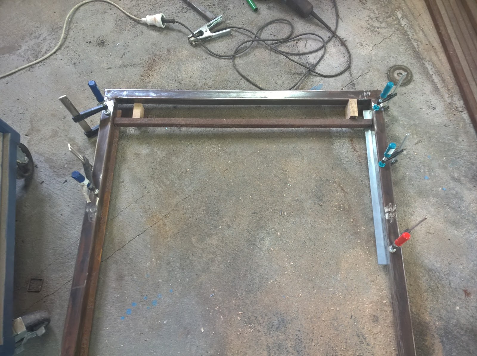 Von dem offenen Rahmen habe ich mir 2x 40cm Stücke mit der Bandsäge abgeschnitten, um diese mit dem geöffneten Rahmen, mittels Elektrodenschweißgerät verschweißen zu können. Damit auch alles schön gerade wird, wurden die Teile mit anderen Formrohren fixiert.