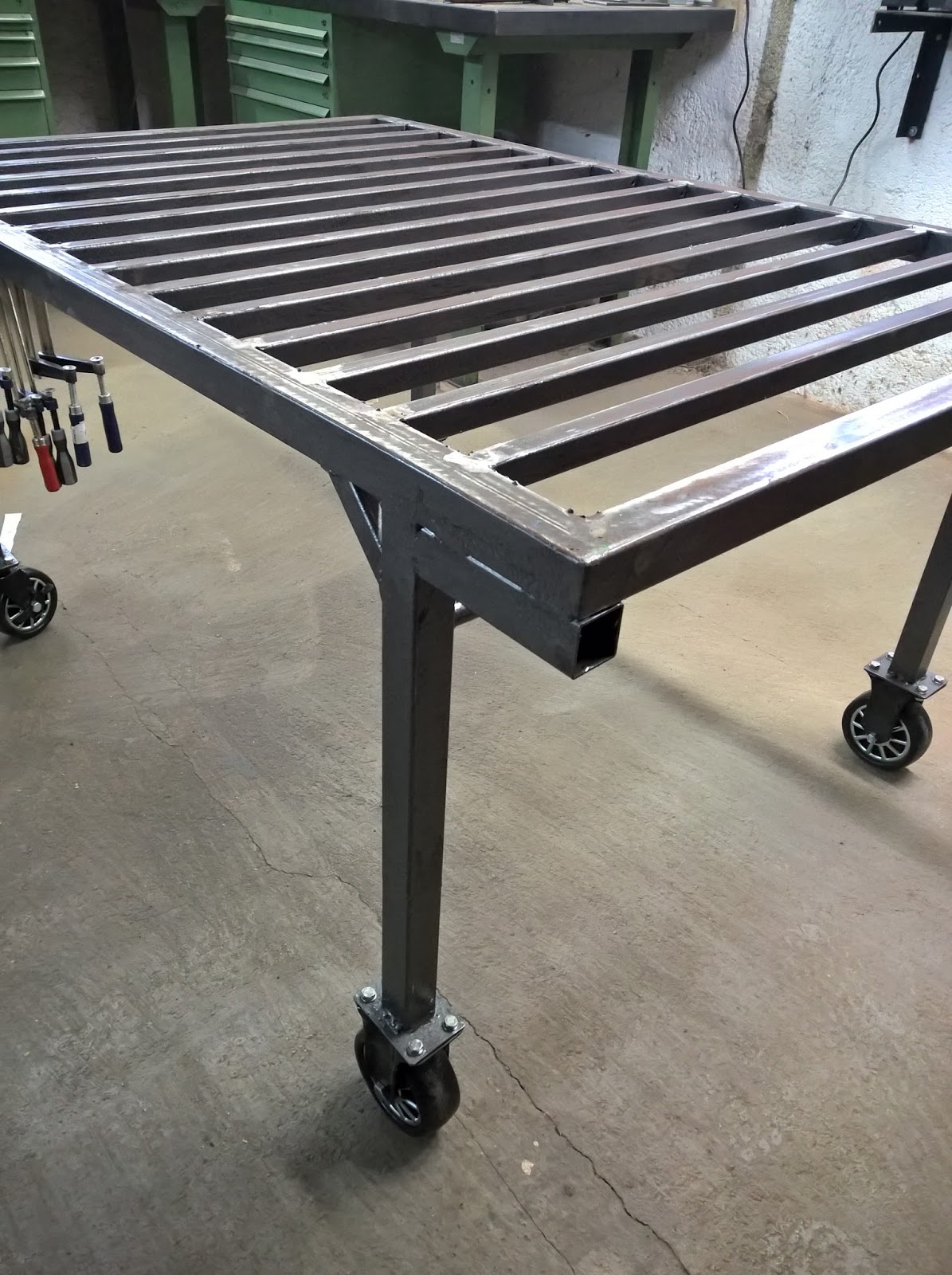 Wie alles Andere auch in meiner Werkstatt soll der Tisch auch fahrbar sein. Ein netter Kollege hat mir die Rollen von seinem Werkstattwagen geschenkt (Danke Roman!) und diese finden somit auch Verwendung.