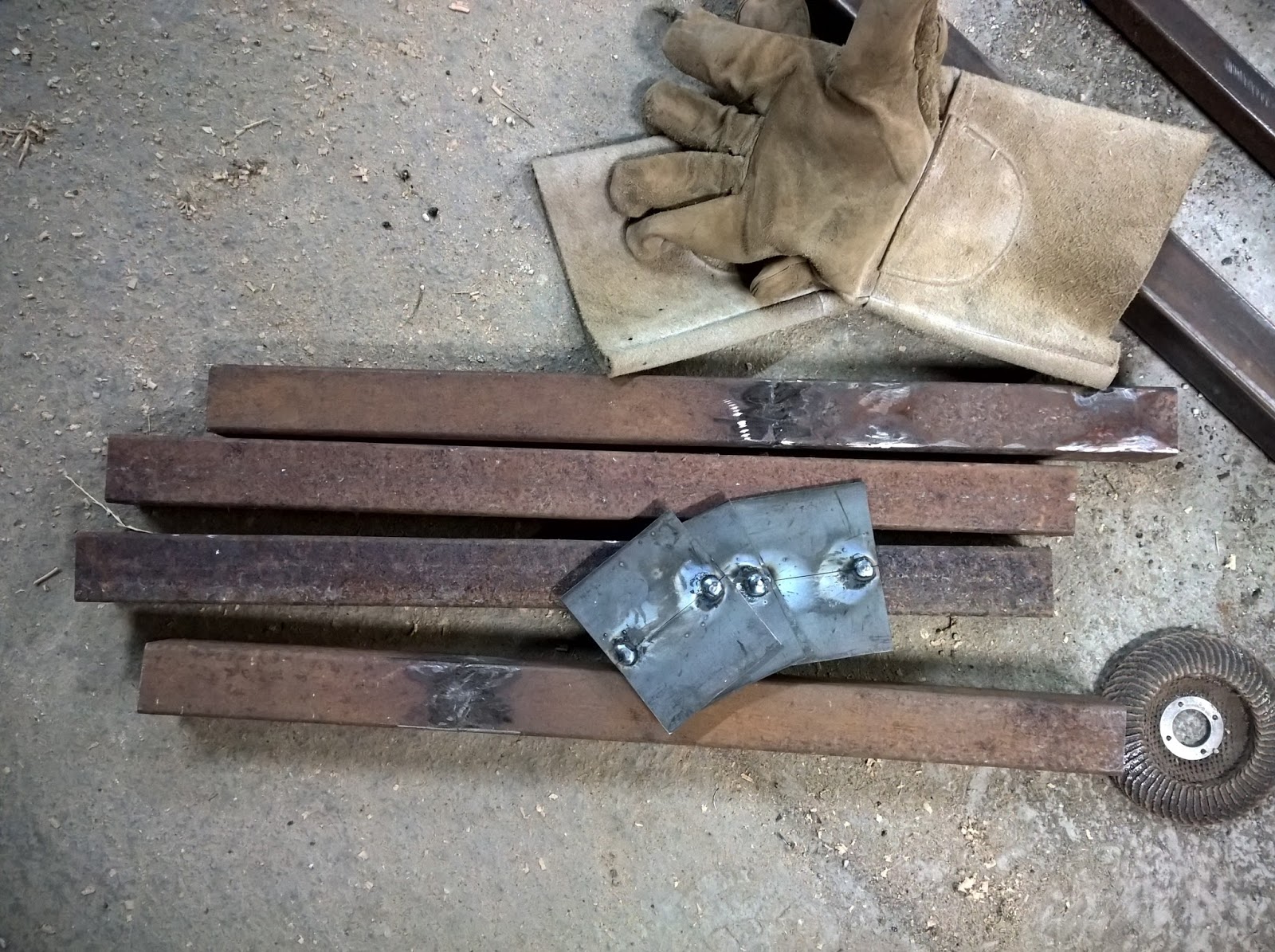Zur Versteifung habe ich 45° Elemente an die Tischbeine geschweißt. Auch wenn diese nur 12cm an der langen Seite ist, wird der Tisch dadurch deutlich stabiler.