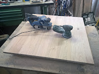 Anschließend habe ich die Tischplatte wieder mit dem Exzenterschleifer in den Körnungen 80, 120 und 240 geschliffen.