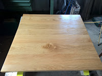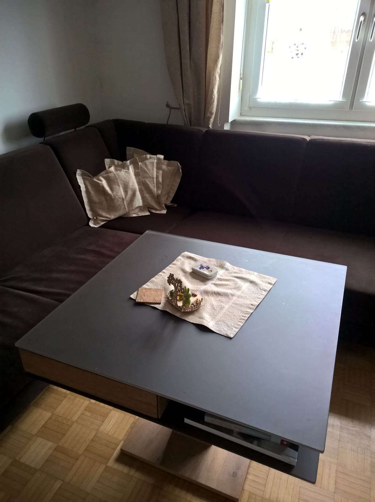 Ich hatte überlegt die 90x90cm der Tischplatte einfach mit dem Maßband anzuzeichnen und zuzuschneiden. Allerdings sind 90° nicht immer 90°. Daher habe ich Naturmaß vom Couchisch genommen... inkl. Schleifstaub im Wohnzimmer...