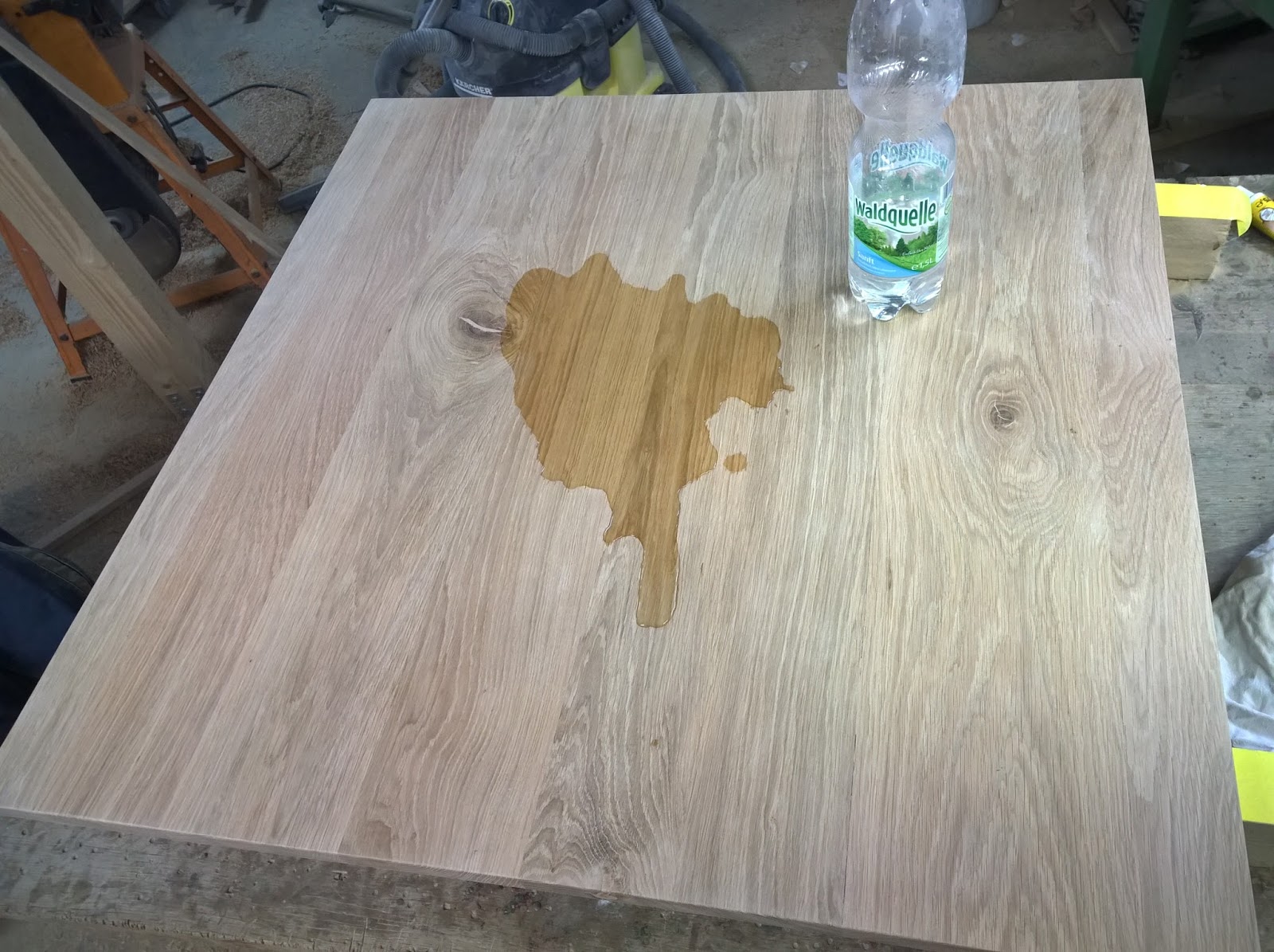 Die Platte hat insgesamt 2 Anstriche erhalten. Ein Dritter wäre nicht mehr erforderlich gewesen, da nach dem zweiten Auftrag ich noch restliches Öl wieder abstreifen musste, sprich: das Holz ist gesättigt.