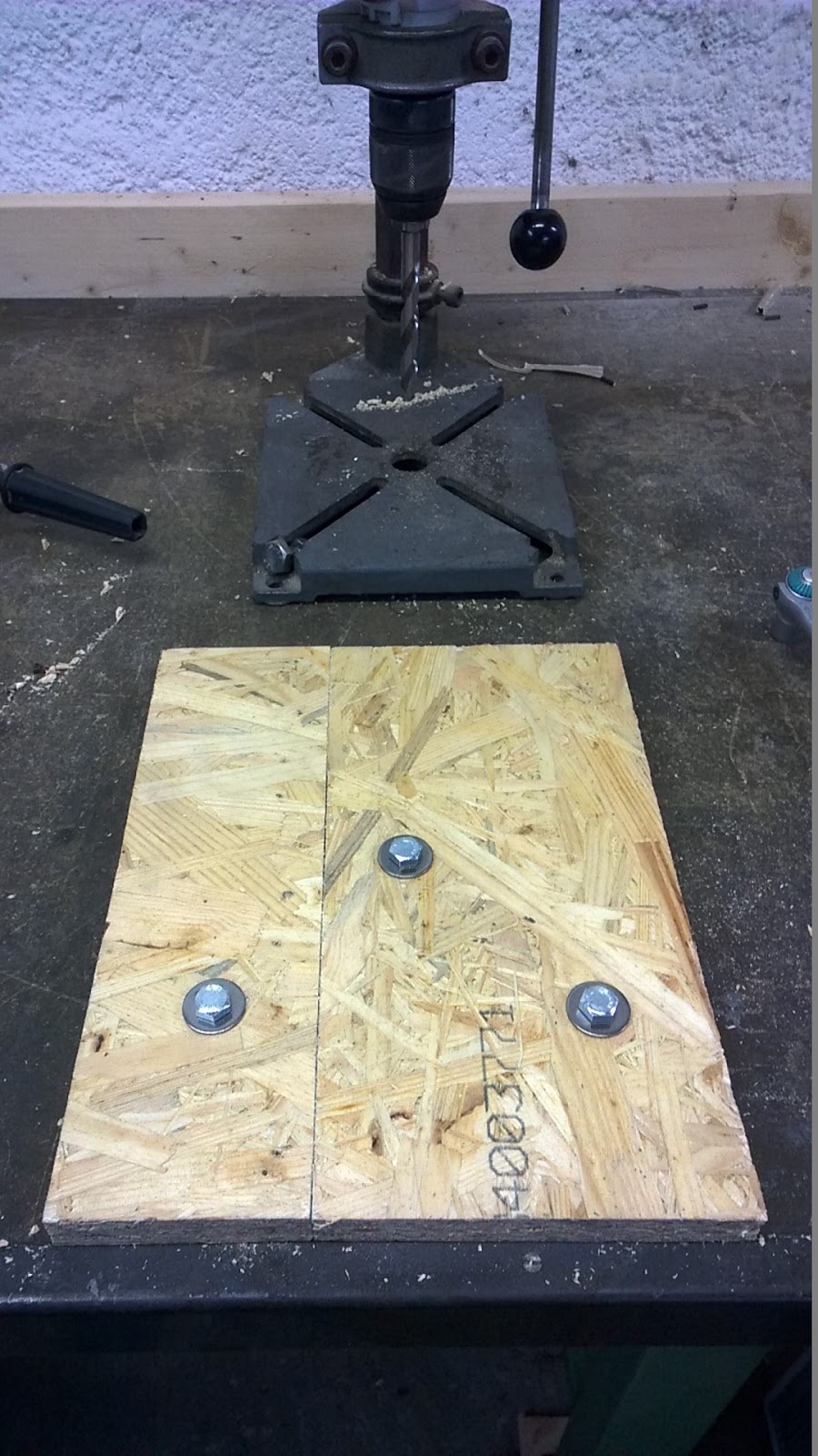 Meinen Bohrständer, welcher immer lose auf der Werkbank stand, habe ich über bestehende Löcher mit der Arbeitsplatte verschraubt. Seit dem bohrt es sich wesentlich leichter. Ein Restestück von einer OSB Platte dient nun als Adapter zwischen den Löchern in der Werkbank und denen des Bohrständers.