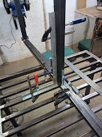 Die Steher bestehen, wie der Rest auch, aus dem 60x30x2mm Formrohr. Um diese rechtwinkelig mit dem Rahmen verschweißen zu können sollten diese mit Schlosserwinkel und Klemmen fixiert werden. Hier zeigt der Schweißtisch seine Stärken!