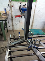 Der Grundrahmen liegt am Boden auf und verspreizt sich gegen die Wände. Außerdem soll dieser die Führung für die Schiebetür beinhalten und mit den zwei Löchern im Boden verschraubt werden. Zusätzlich werden 3 Steher angeschweißt, die die Türen halten.