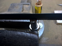 Mit der Eisensäge wird anschießend ein Schlitz in die Schnittfläche geschnitten, um später die Schraube mit dem Schraubendreher drehen zu können.