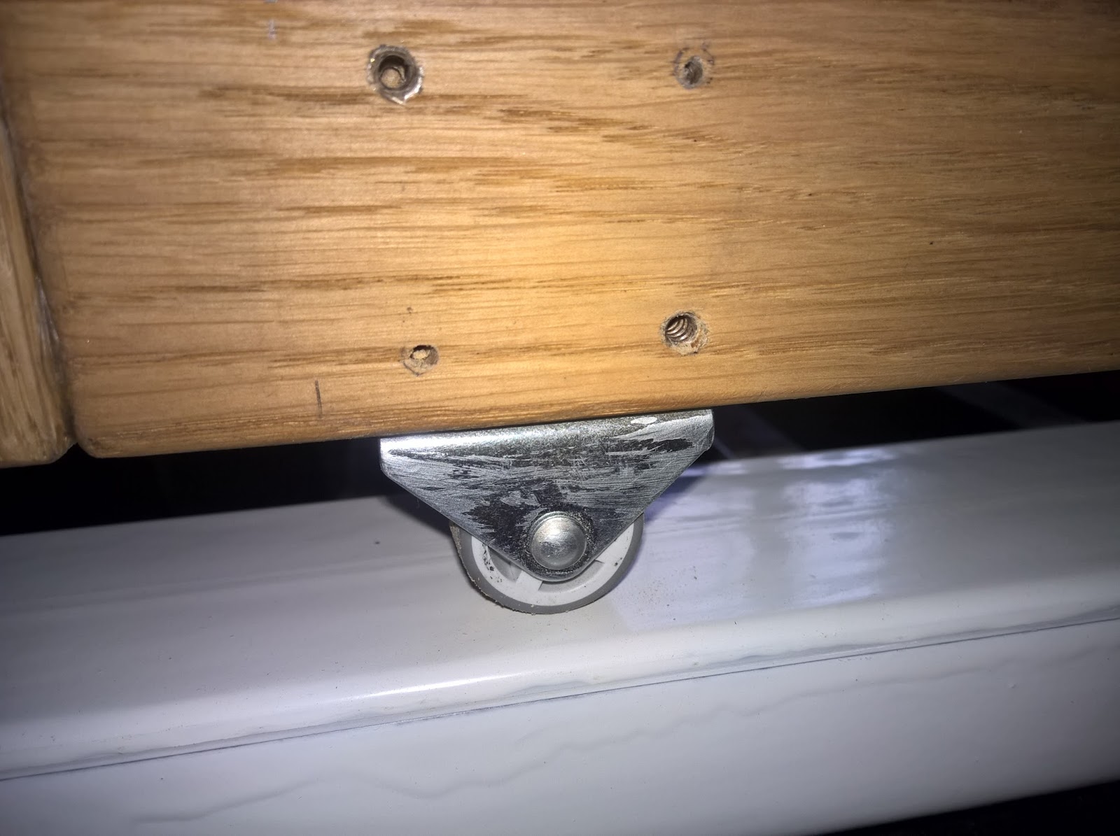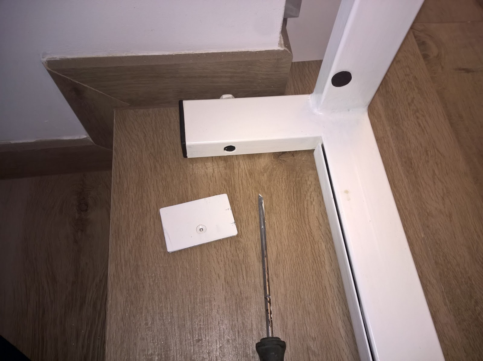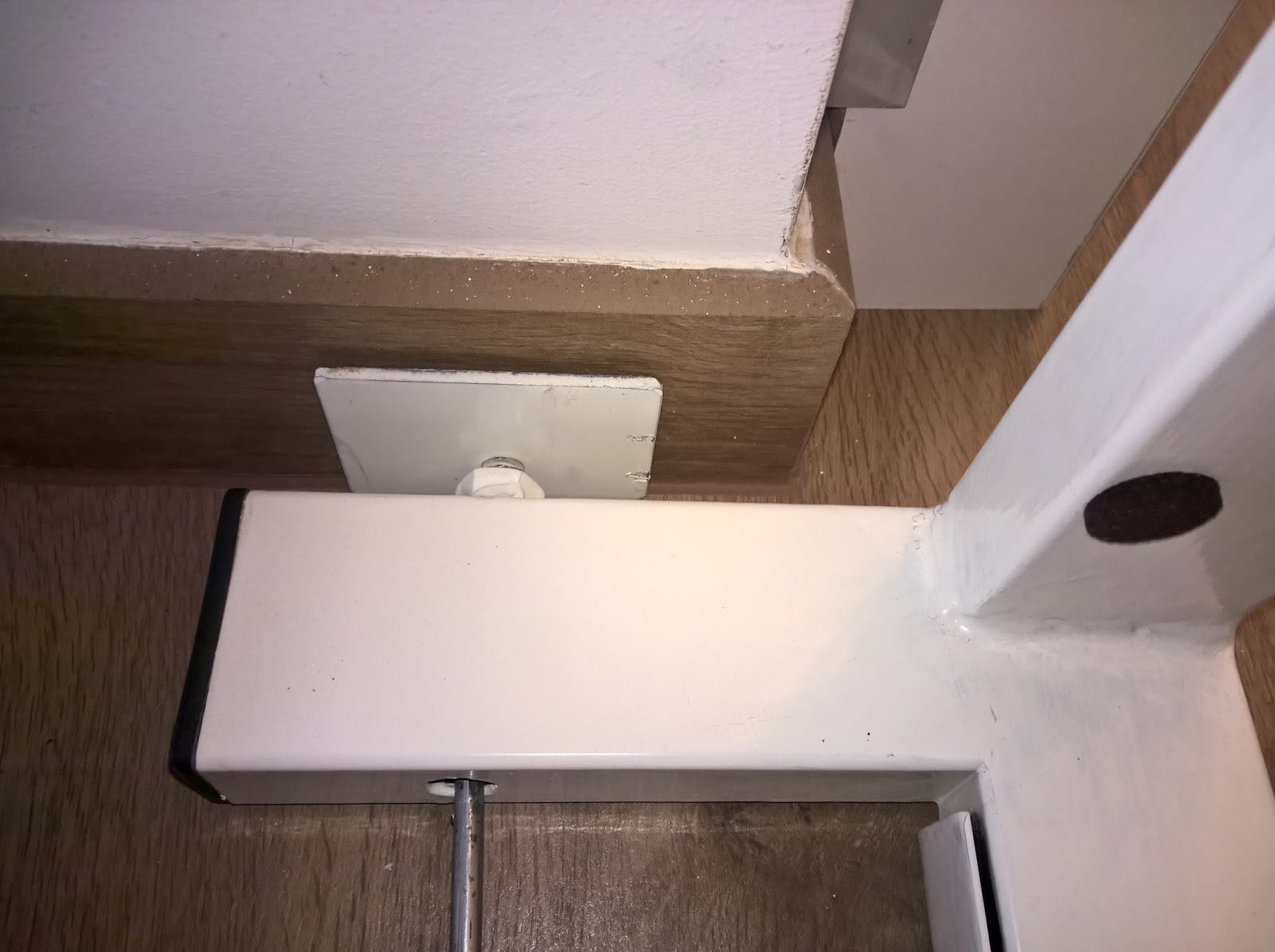 Die linke Seite drückt mit einer großen Eisenplatte gegen die Sockelleiste. Der verstellbare Teil, an welchen sich einige cm Toleranz ausgleichen lassen, befindet sich an der linken Seite. Hierzu drückt eine angespitzte Schraube auf einen Blechstreifen, welcher wiederum den Druck auf die gegenüberliegende Sockelleiste verteilt. Über die Schraube aus Teil 1 kann der Anpressdruck stufenlos mit einem Schraubendreher eingestellt werden. Selbstverständlich befinden sich Gummifüße auf den Eisenplatten als Puffer und dass die Sockelleisten nicht zerkratzt werden.