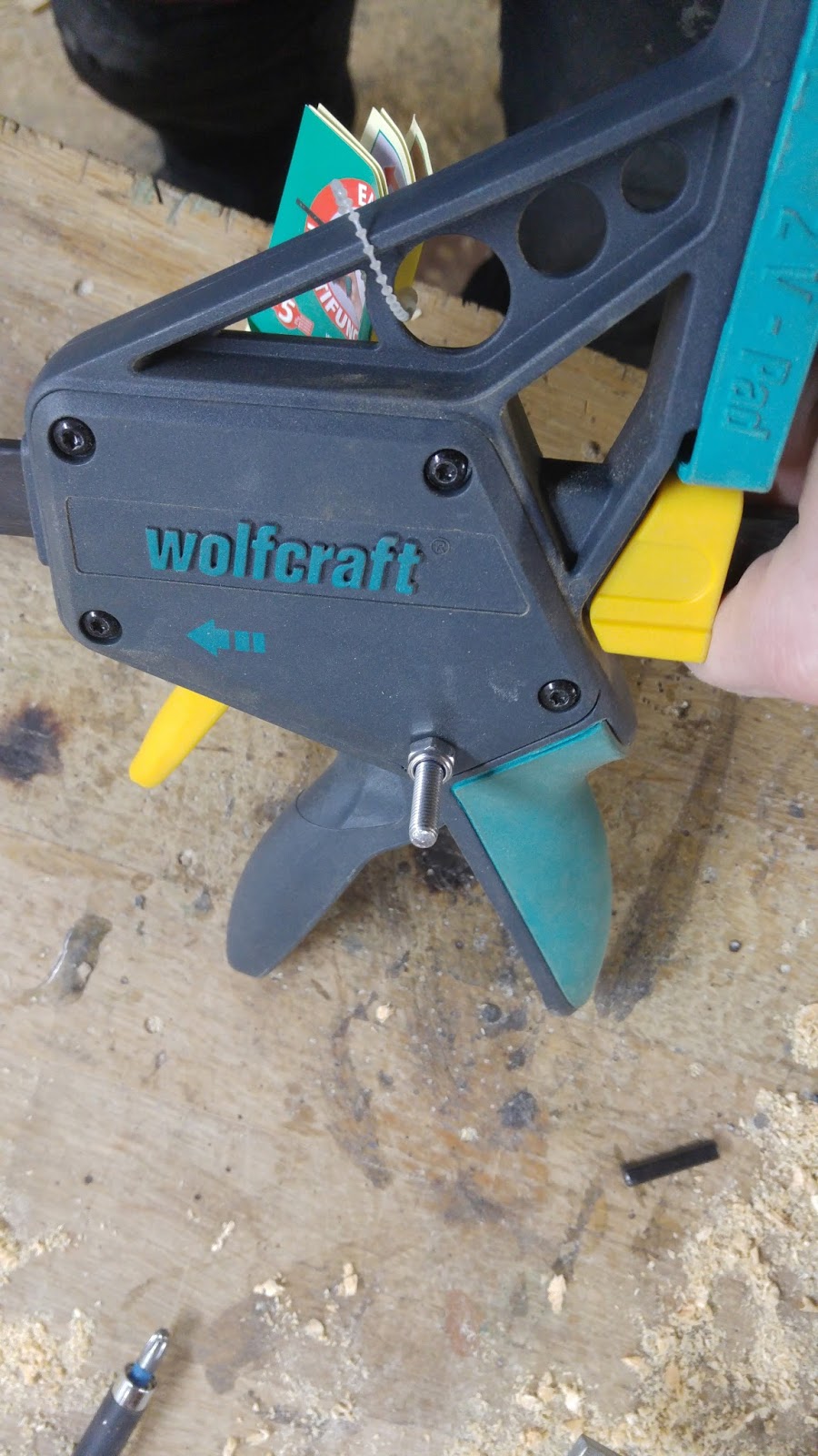 Ich habe Bretter verleimt, und dabei die Wolfcraft Klemme mit beinen Händen bearbeitet um mehr Druck auf die Bretter ausüben zu können. Die Kraft zweier Hände war anscheinen doch etwas zu viel und im inneren der Klemme brach etwas ab. Vermutlich heißen die Dinger deshalb EINHANDzwinge weil man sie nur mit EINER HAND bedienen soll und nicht, so wie ich, gleich mit zwei.