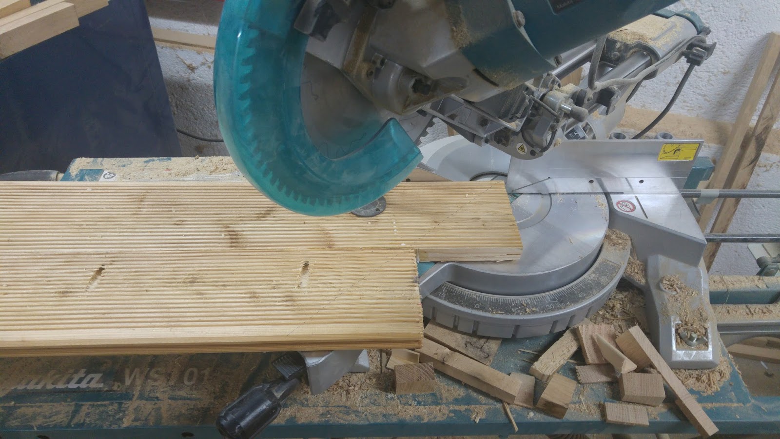 Wenn der Leim trocken ist, können die entstanden Bretter der Sitzfläche in Gehrung geschnitten werden. Ich habe dies mit meiner Makita Zug- Kapp- und Gehrungssäge erledigt.