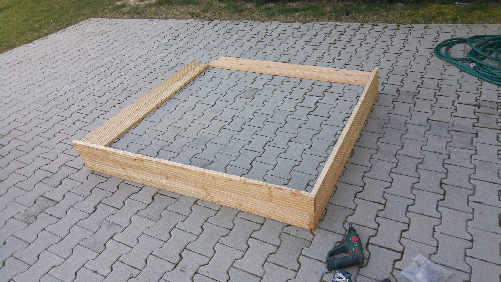 Zusammengebaut habe ich den Sandkasten dann im Freien, denn als Ganzes hätte ich dieses unmöglich durch meine Werkstatttür gebracht.