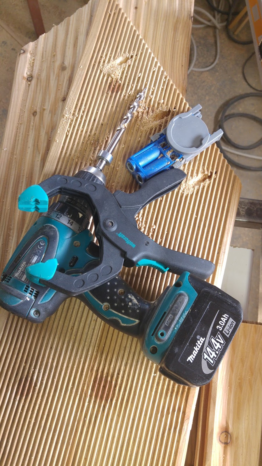 Zum fixieren der Bohrhilfe verwende ich übrigens eine günstige Ratschenzwinge von Wolfcraft.