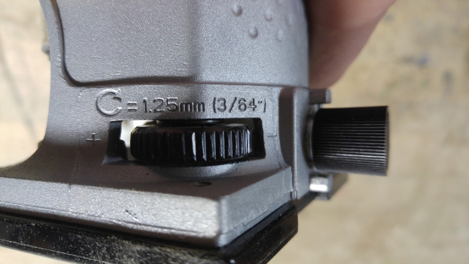 Bevor muss allerdings der Fräskorb noch in die richtige Position gedreht werden, damit das Gewinde der Stellschraube auch greift. Wie am Bild ersichtlich bedeutet eine Umdrehung einen Hub von 1,25mm. Das geht sehr genau und das war auch der Grund warum ich mich für diese Fräse und nicht für die Makita entschieden habe. Bei letzterer ist eine Einstellung mit den dafür vorgesehenen Rad nur sehr grob möglich und eine Umdrehung entspricht einige Millimeter.
