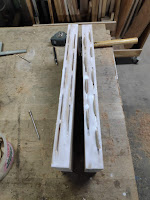 Da ich damals das Reststück mit der Stichsäge ausgeschnitten hatte, musste ich die zwei Hälften noch auf der Tischkreissäge begradigen.
