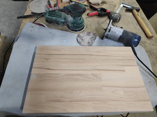 Danach ist das Brett zwar gleichmäßig dick, aber sehr rau. Jetzt kommt der Exzenterschleifer zum Einsatz. Ich habe hier Körnung 80, 120, 180 und 240 verwendet.