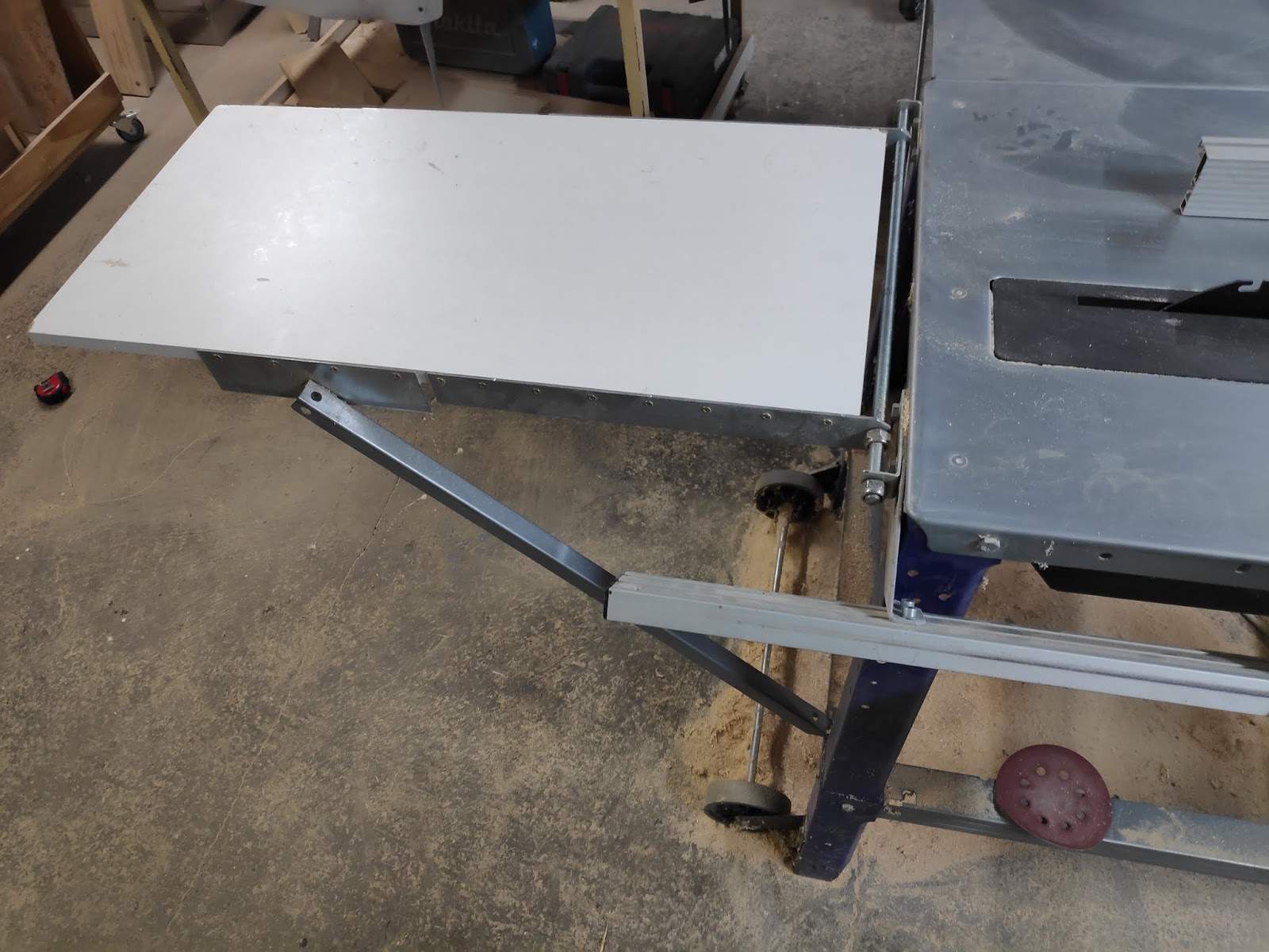 Ohne Tischverlängerung wollte ich die Säge nicht betreiben, da sonst längere Werkstücke hinter der Säge nach unten kippen würden. Hier habe ich einfach eine beschichtete Spanplatte an der Rückseite montiert. Die originalen Stützen können hier zum Einsatz kommen. Keine Hexerei...