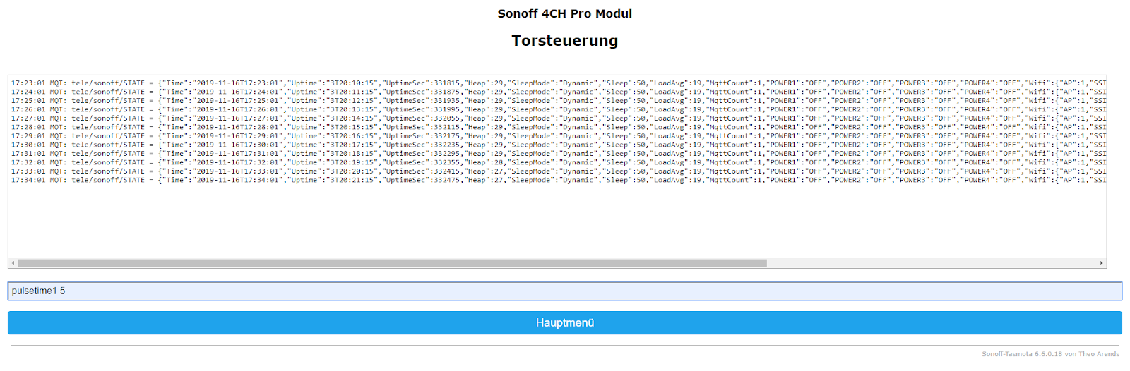 Wenn der Sonoff richtig als 4CH Pro parametriert wurde, sollte dem Ding noch beigebracht werden, sich wie ein Taster zu verhalten, sprich: wenn ein Kanal eingeschalten wurde, soll dieser nach kurzer Zeit wieder ausschalten. Tasmota sieht dazu den Befehl PulseTime vor. Als Einschaltdauer habe ich 0,5 Sekunden gewählt. In die Konsole in Tasmota gibt man daher PulseTime1 5 für den ersten Kanal ein. Für den zweiten Kanal wird PulsTime2 5 eingegeben usw. usw.