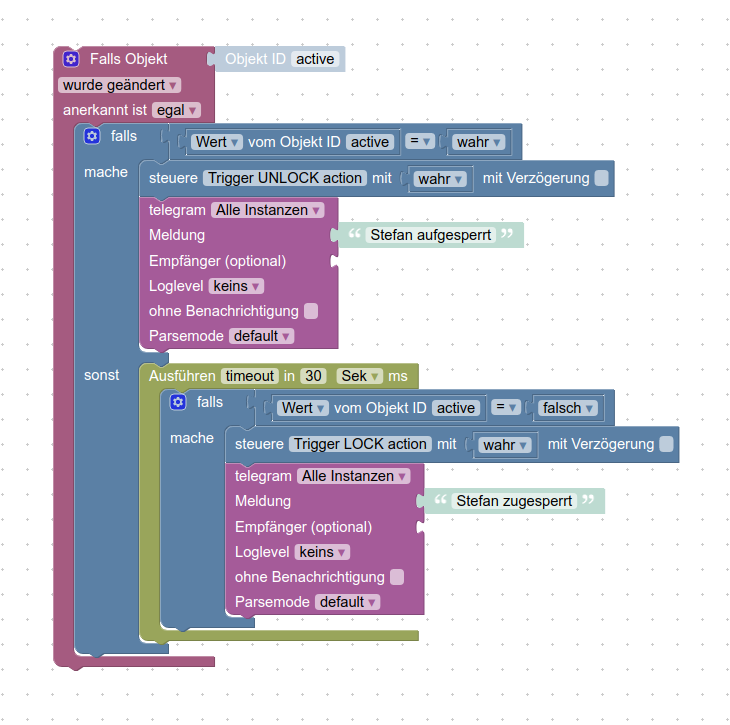 Das "timeout" im Blockly verhindert unnötige Aktionen, da ich festgestellt habe, dass sich zumindest mein Telefon, selten aber doch kurzzeitig aus dem Wlan ab und dann wieder anmeldet.