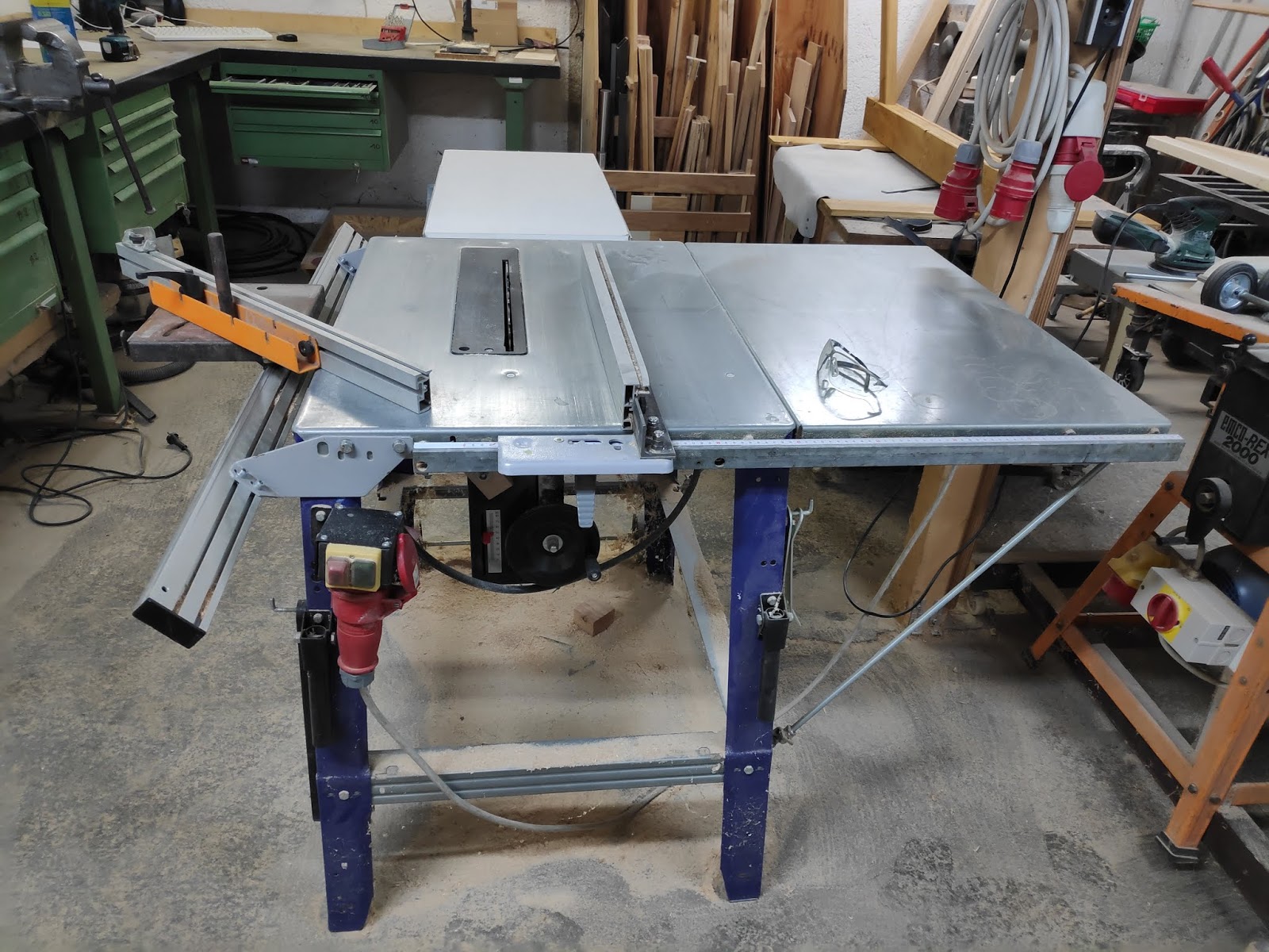 Vor etwa 2 Jahren kaufte ich mir eine "neue alte" Tischkreissäge mit starken 4,2kW Motor, da meine bisherige Scheppach TS 250 zu wenig standfest und zu leistungsschwach war, um einen Längsschnitt in einer 5 cm starken Eichenbohle zu bewältigen. Darum kaufte ich mir eine gebrauchte Metabo TKHS 315 M - 4,2 DNB . Diese habe ich an meine Bedürfnisse angepasst.